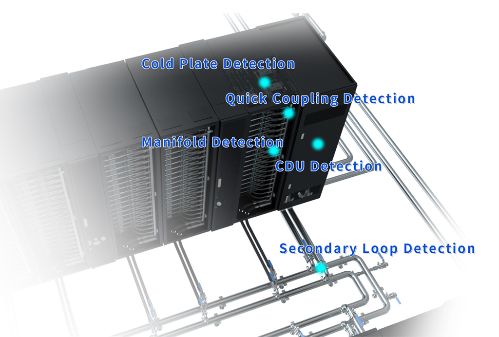 All-round leak detection: It can effectively monitor whether liquid leakage occurs in various equipment, coldheads, pipelines, branch pipes, connectors, valves, water pumps, etc. in the entire liquid cooling system. In this way, the intelligence and safety of the liquid cooling system are improved and unattended system operation can be ensured, making it more safe with less risk of accidents.